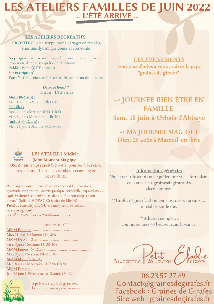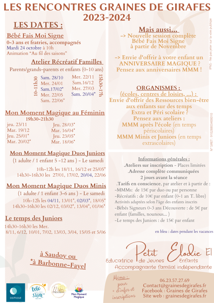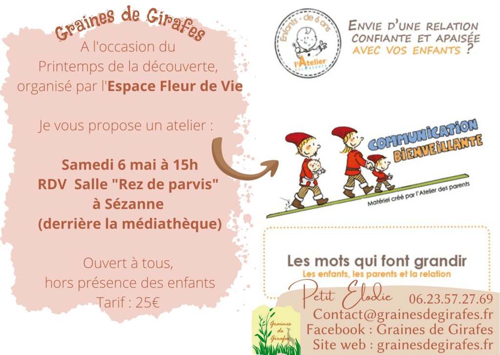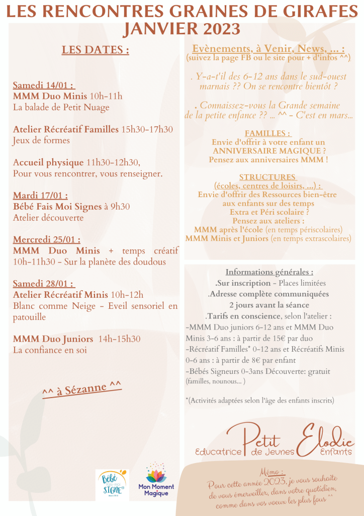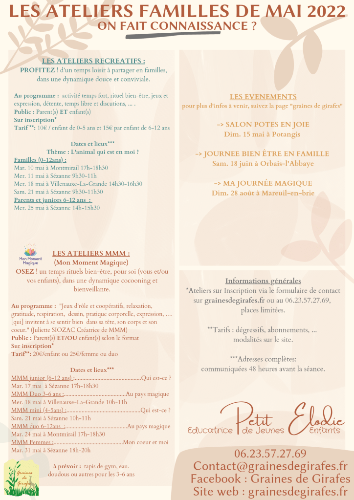 Pour répondre à vos questions, vous guider dans le choix d’un atelier, faire connaissance, ….. je vous propose de choisir un moment pour se contacter au téléphone ou en visio. Il est également possible : – de prendre un rdv à l’occasion d’un besoin d’accompagnement à la parentalité – de vous inscrire à un atelier