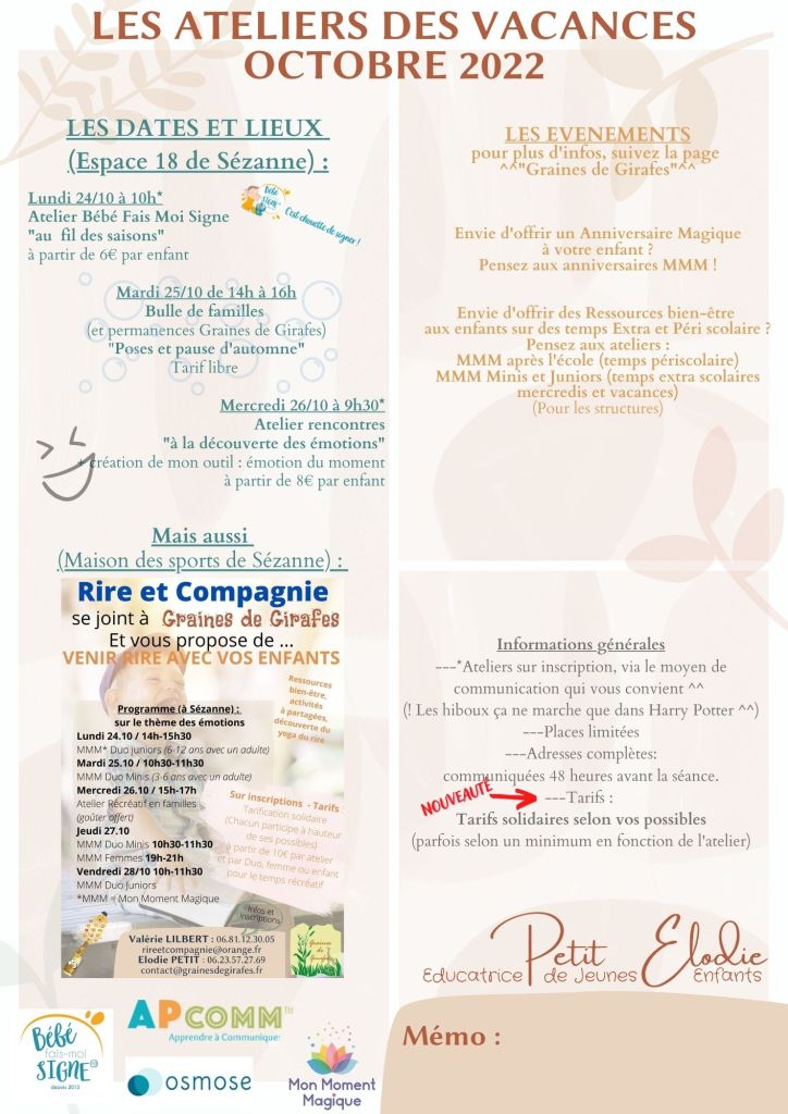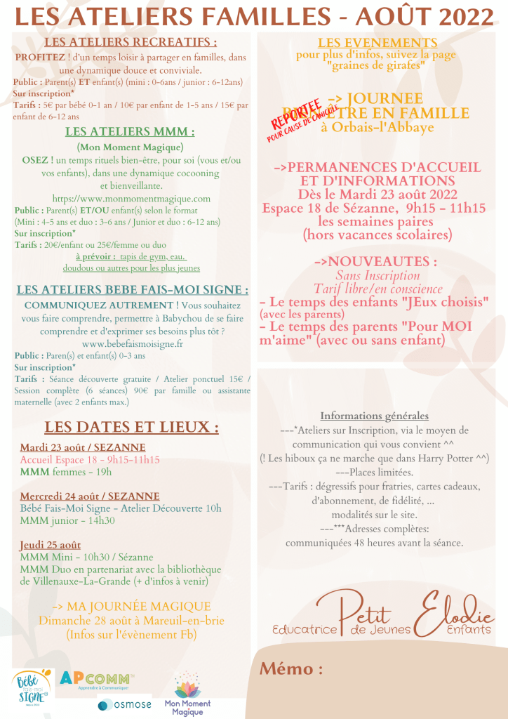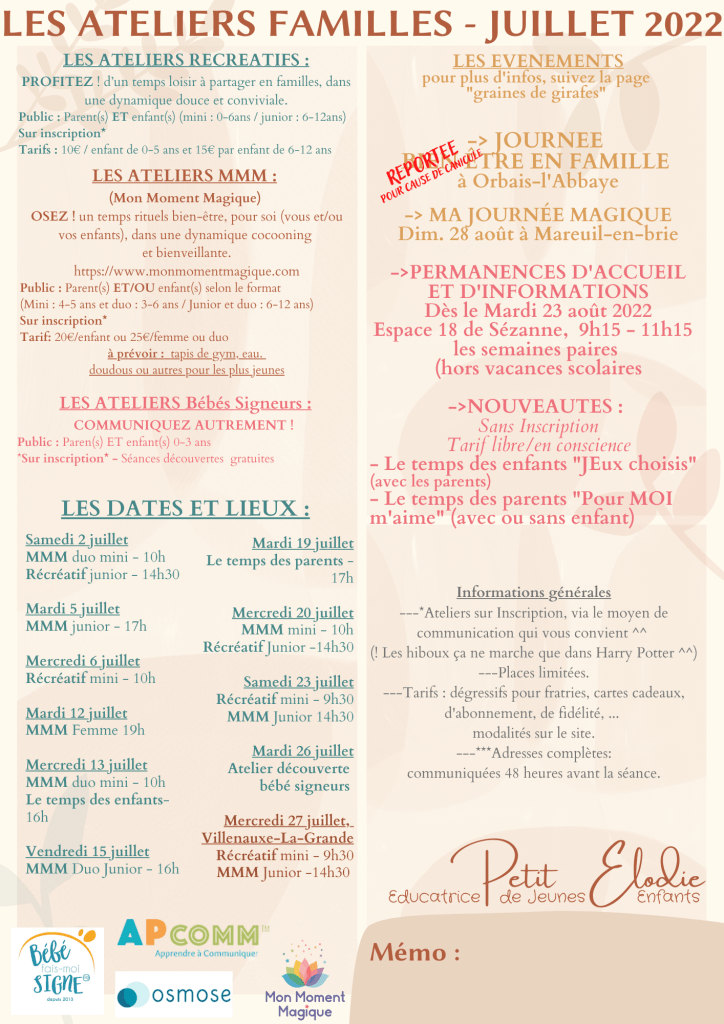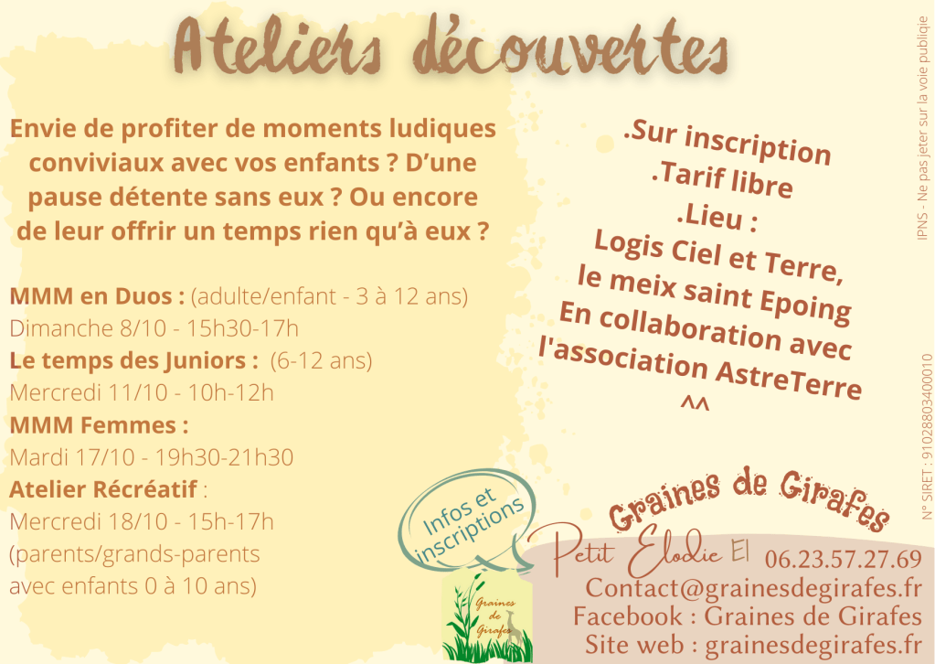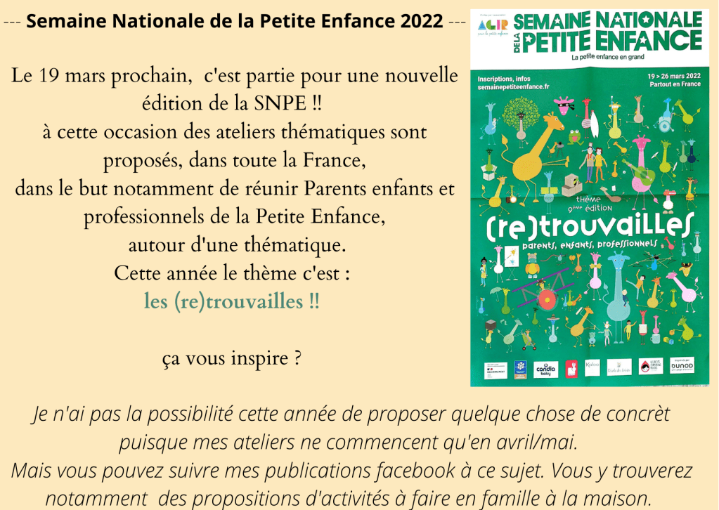 Pour répondre à vos questions, vous guider dans le choix d’un atelier, faire connaissance, ….. je vous propose de choisir un moment pour se contacter au téléphone ou en visio. Il est également possible : – de prendre un rdv à l’occasion d’un besoin d’accompagnement à la parentalité – de vous inscrire à un atelier